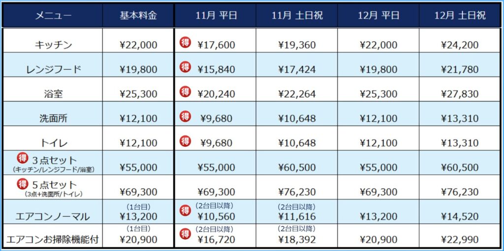 大掃除応援企画といたしまして、こちらの水回りメニュー5カ所を11月末実施までの