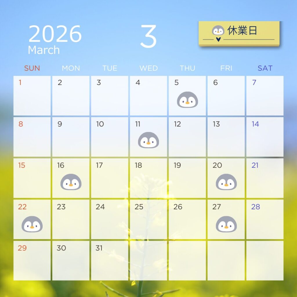 さて、誠に勝手ながら、3月の休業日を下記の通りご案内させていただきます。