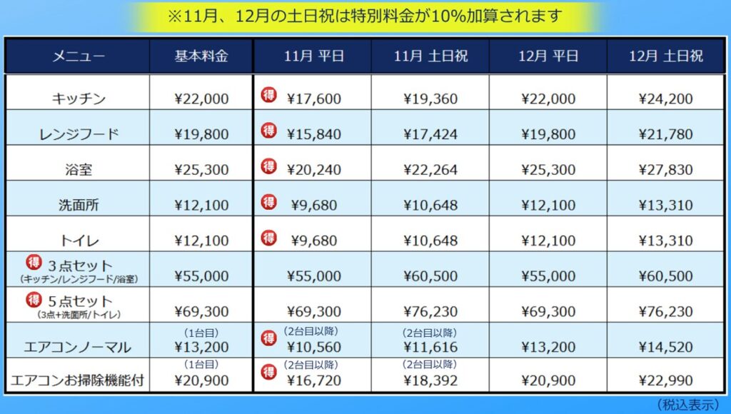 大掃除応援企画といたしまして、こちらの水回りメニュー5ヵ所を11月末実施までの